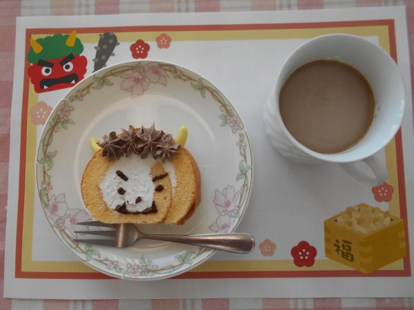 ゲームを楽しんだ後は、職員手作り鬼の顔のロールケーキをおやつに召し上がっていただきました👹
